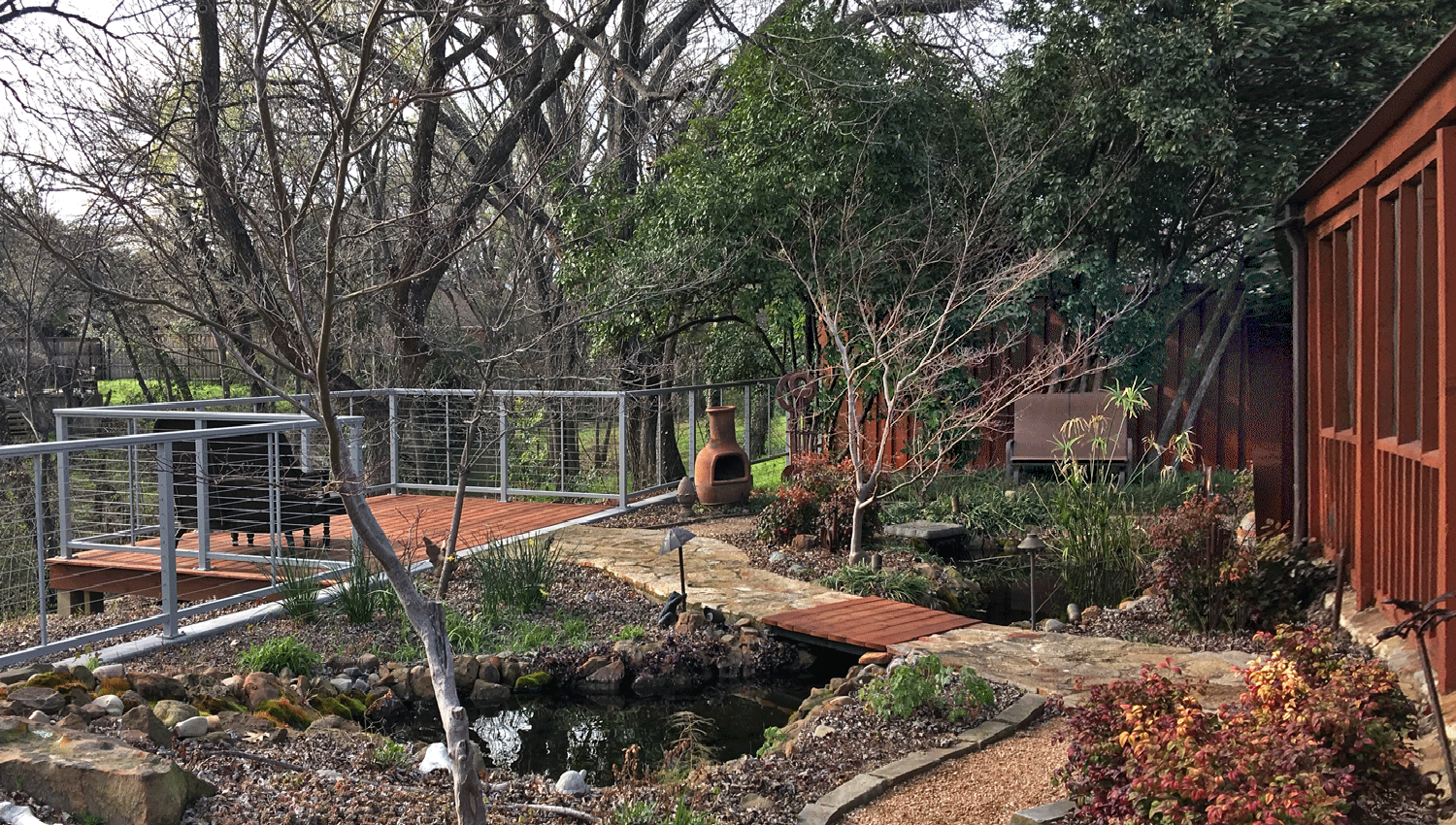 A landscape architect I worked with referred me to these clients, who needed a new fence, deck, and bridge. To maximize the view, I recommended they replace their existing wooden railing with this more open stainless steel cable rail system. The cedar deck was a relatively straightforward job, but the little bridge was trickier than it looks, because it had to be strongly supported and set perfectly level with the stone walkway.